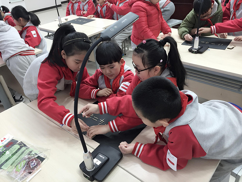 課堂上,解老師和楊老師結(jié)合無線微錄儀的互動特點,小組討論的同時利用微錄儀將小組的討論過程即時錄制讓同學們參與討論交流;老師啟發(fā)性提問,任意調(diào)用小組即時畫面,同學們積極的回答問題,分享自己的解題思路并在微錄儀下進行操作演示;應用分屏對比教學,對不同小組的作品生生互評,老師對重難點進行標注和講解。