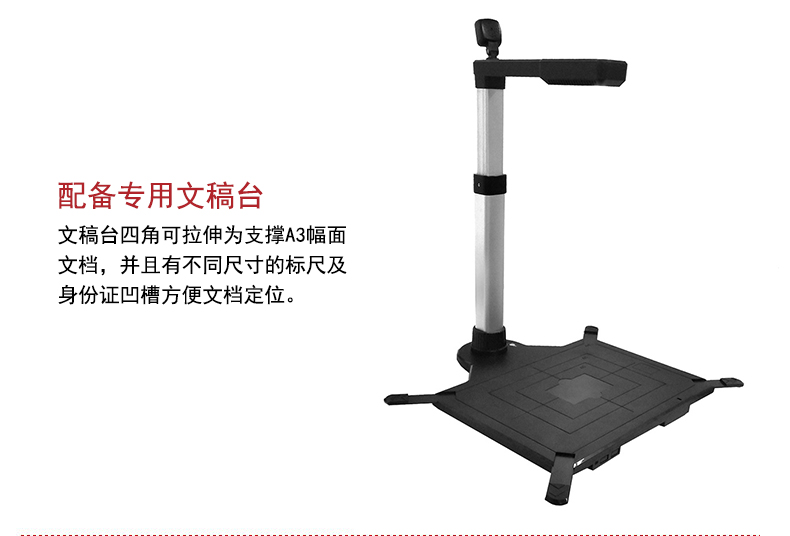 | 底座 | 固定可伸縮底座(底座可依據(jù)所掃描文件及物品的幅面范圍滑動調(diào)節(jié)) |